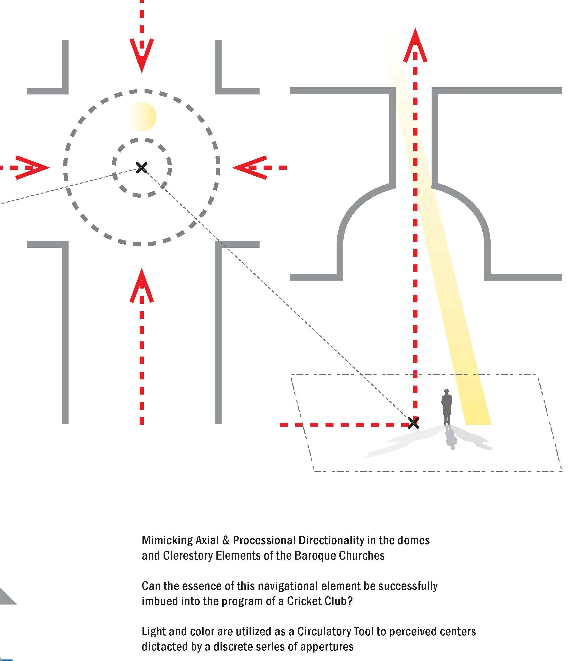 This project focuses on directionality dictated by the program, originating from the processional scope of Baroque churches, with a central focus under the dome. Through negotiating Hedjuk’s 9 square with the Baroque fragment, the proposal ignores direct representation equally - it does not communicate 9 squares planimetrically or elevationally, nor does it replicate a Baroque fragment, such as a pilaster or cornice, outright. The 9 square is blurred by shifting, pinching, absorbing forms subtly, thereby allowing light infiltration through a discrete set of light “moves” generated from the program. In borrowing the intentionality imposed by program, evident in the churches studied, light is used as a circulatory driver organizing program and delivering hierarchy.