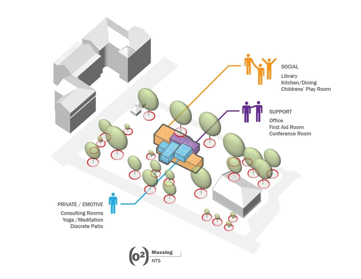 Nature is a source of healing and the Oxygen Home’s location in Bror Hansson park (Krakow, Poland) enhances the appeal of the green-space and creates a functioning environment. The design incorporates the existing trees by framing them in the views from the windows, celebrating the power of nature, and creating a vista to the park within every open area of the facility. The park fabric is brought up to wrap the building in a warm “blanket” and is re-configured to allow for better access and playful spaces. Two children’s play areas along with gentle sloping hills for summer sunbathing or winter sledding provide an outlet of recreation. Paths meander through the trees providing open spaces or private respite. A green roof tops the building to create a continuous habitat for wildlife. The Oxygen home promotes healing through nature and creates a vibrant park for the community.