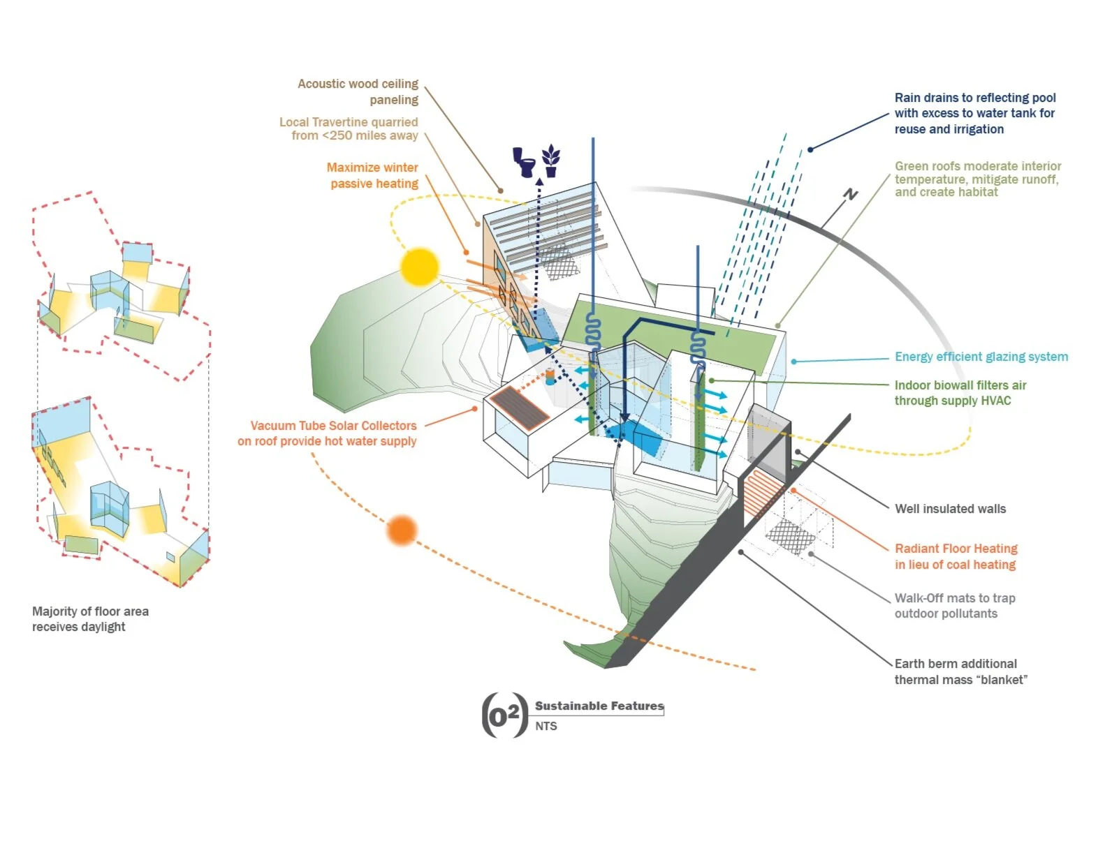 South, East, and Western exposures all have shading devices while the North is left open to maximize light for the low winter sun. Rainwater is captured on site and reused for irrigation and greywater fixtures.