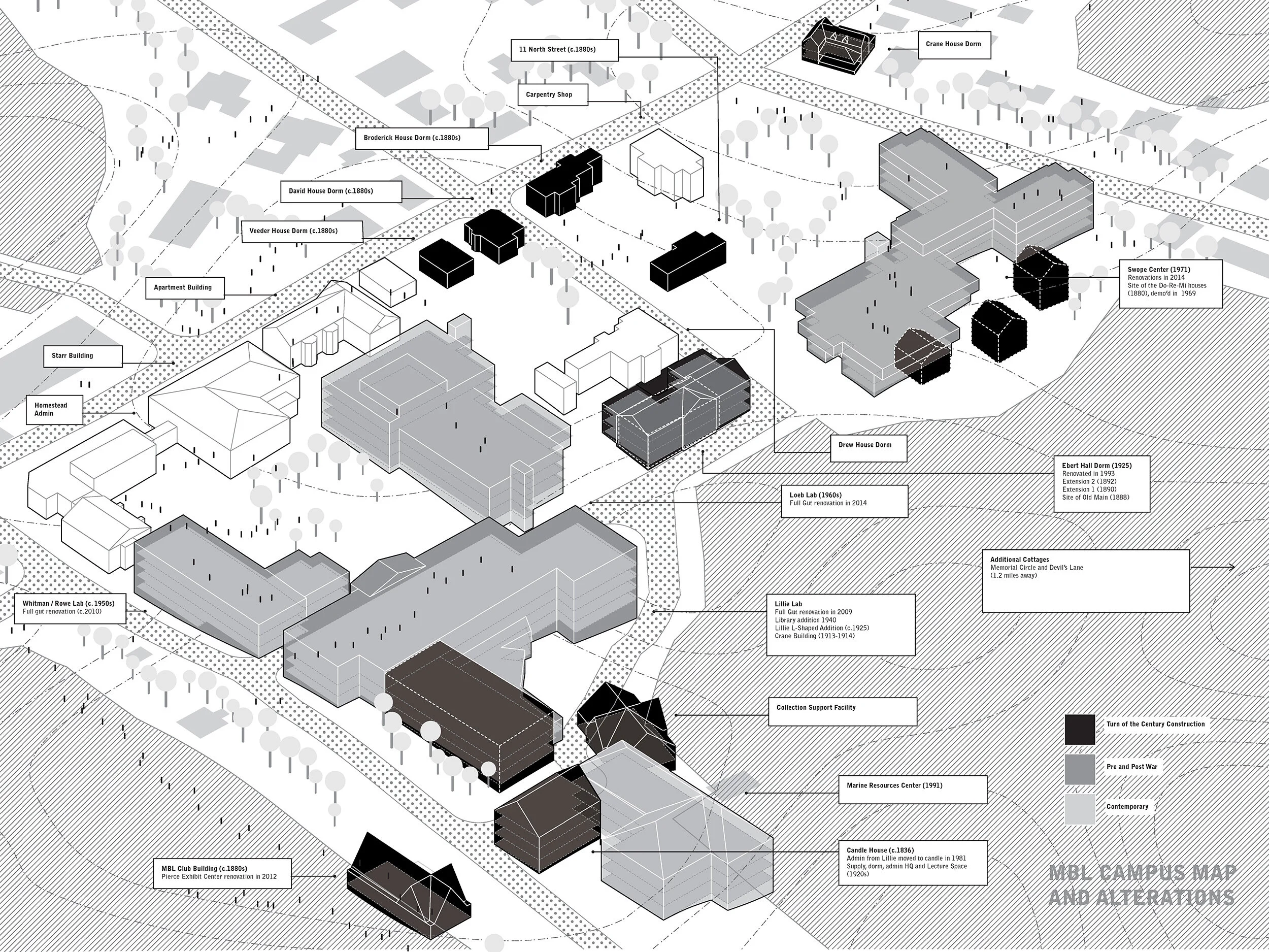 The history of the Marine Biological Laboratory (MBL) campus and their research spans more than 130 years of marine, biomedical, and environmental science and their contributions to the field have been numerous. Located in the Town of Falmouth on the Southwestern corner of Cape Cod, MBL has 275 year-round employees, almost 500 scientists, summer staff, and researchers, as well as around 550 students from around the world. Peak loads in the summer have reached 1000 scientists operating on site with an almost negligible amount in the winter. The various buildings on site (Lillie, Loeb, Whitman, pictured here) are comprised of primarily research and science facilities with an auditorium in the Lillie building