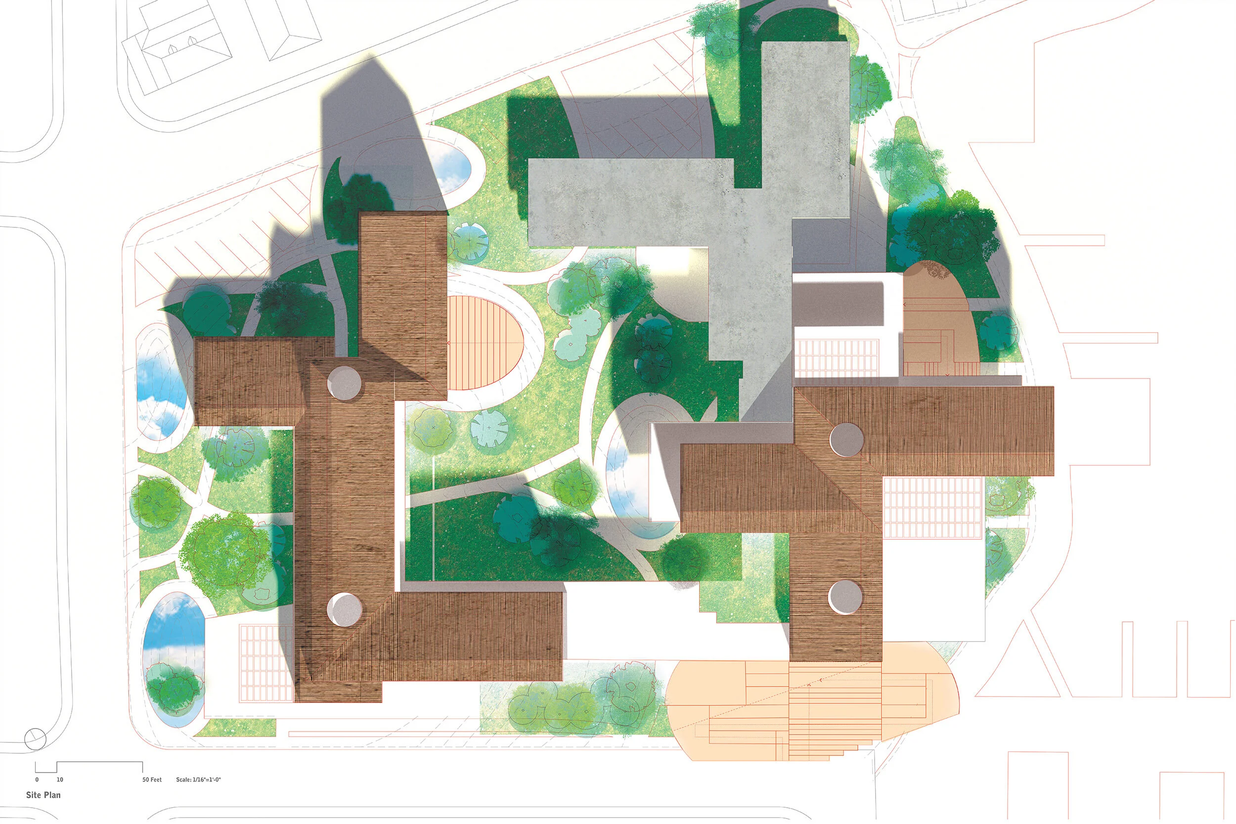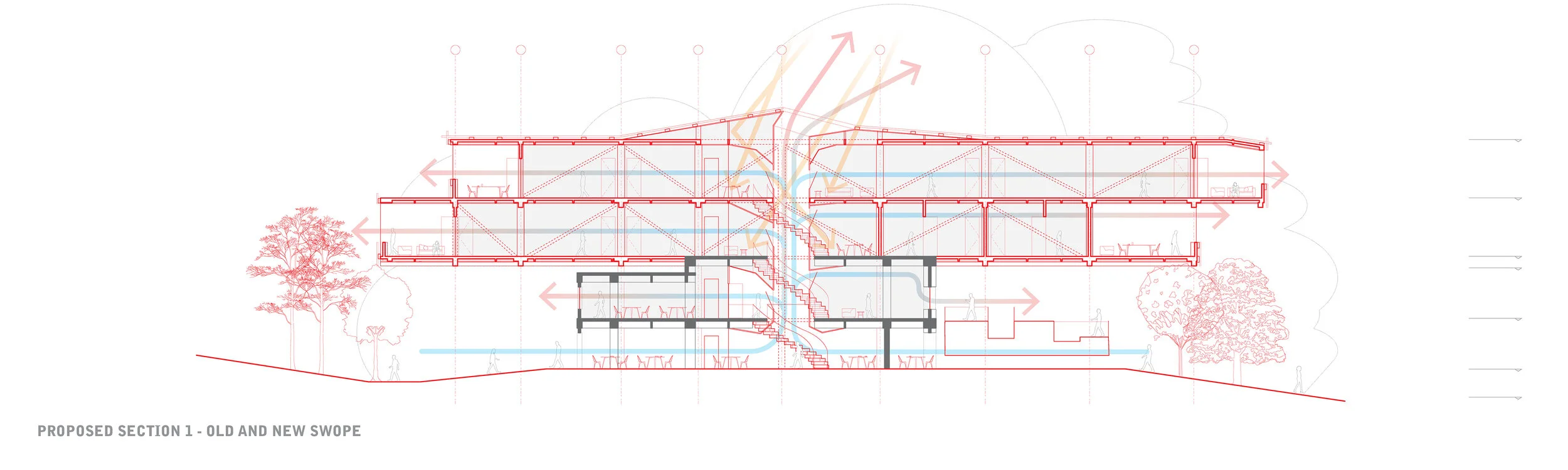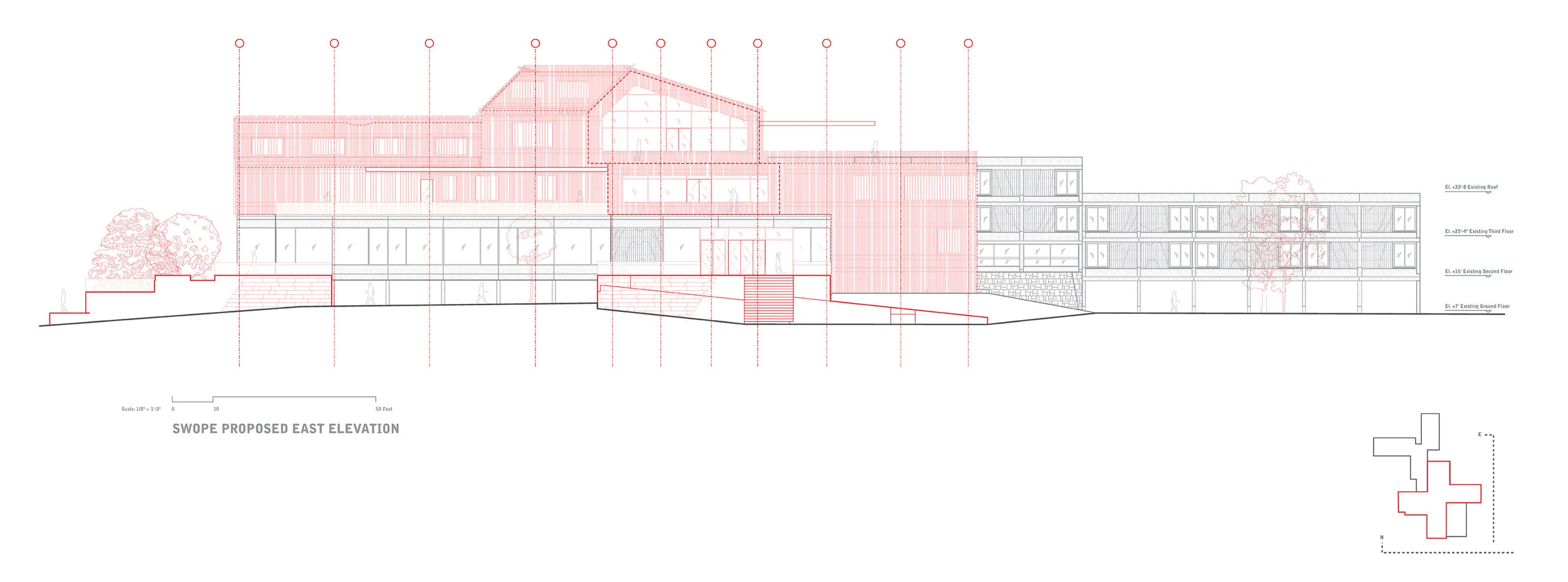 Additionally, in revisiting earlier plans from the original architect, Swope was intended to jog around its site forming a courtyard on its interior – the new vision seeks to realize this as well, forming a social hub on the north side of the campus.