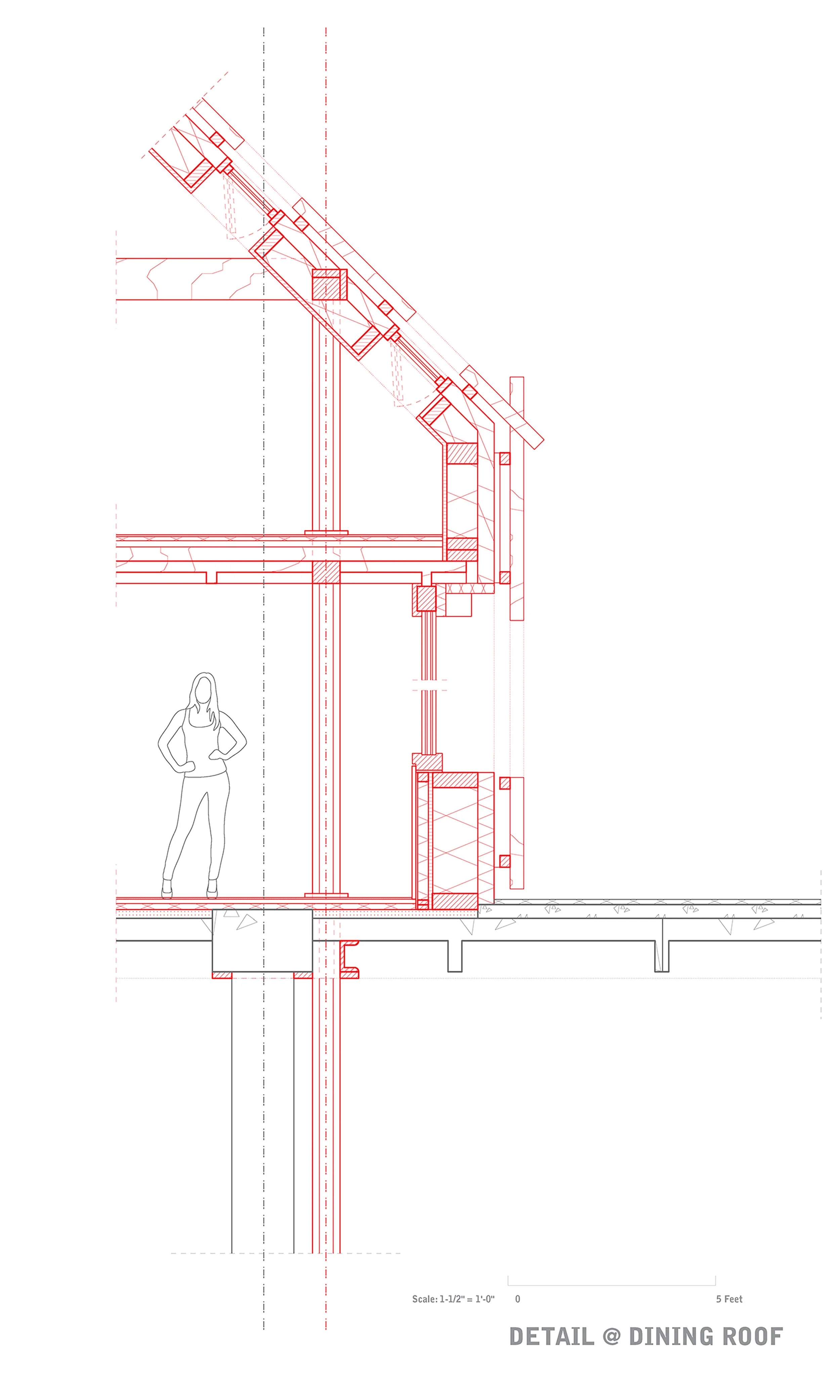 The form emerged from these early analysis in studying the DNA of Swope, specifically the dorm wings, and mimicking the building’s gestures and amplifying the logic already present or originally intended. Expressing the horizontality of the ribbon windows, incorporating the efficiency of the double loaded corridors of the housing (in plan and section), and repeating the rigorous repetition of the precast coffers, new limbs grafted onto itself, much like the Axolotl research next door (a creature that can fully regrow appendages). In elevation, the projecting bays mimic the gable roof and salt-box roof types in the region as a nod to the surrounding formal character.